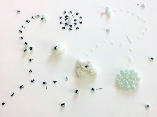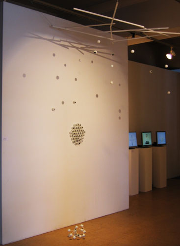 "cocoon". The human cell has a system for communicating with its environment that enables it to permanently emit and receive "messages" that reflects its spatial position. Exploring the universe of these "cells", I decided to create a visual alphabet, symbolising a form of communication, an internal language. that is incomprehensible to those who do not know the code.